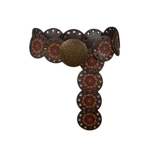 This belt is crafted in leather, featuring round studs with perforated details and a floral and abstract Paisley-inspired print. The metal buckle reflects the motif through engraved detailing and is accented with the ETRO logo. Made in Italy. Composition: 100% Leather.