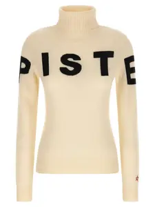 This cable sweater from Perfect Moment features a snow white color, long sleeves, a high neck, and a stylish star embroidery on the front, making it a perfect addition to your wardrobe.