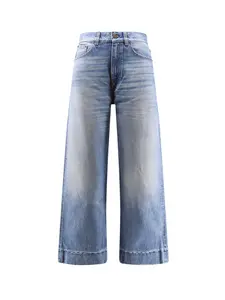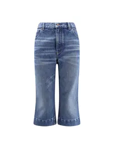 These high-waisted blue denim Capri jeans feature a zip and button closure, five pockets, and a logo patch on the back. Made in Italy from 100% cotton, these jeans combine style and comfort.