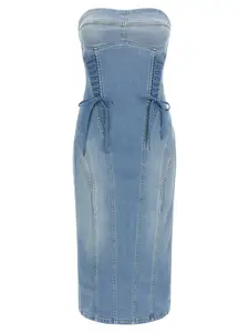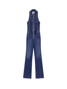 This stylish urban denim jumpsuit features a zip closure, pointed collar, and exquisite lace detail. It's designed with a sleeveless silhouette for a modern look. Made in Italy from a premium blend of 79% cotton, 15% lyocell, 4% elastomultiester, and 2% elastane, this jumpsuit is both comfortable and fashionable.