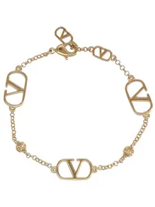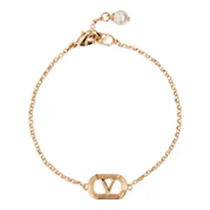 Discover the elegance of the Valentino Garavani gold Ovalette bracelet featuring a stylish hook closure and a prominent frontal logo. Made from 100% metal, this bracelet is the perfect accessory for any occasion.