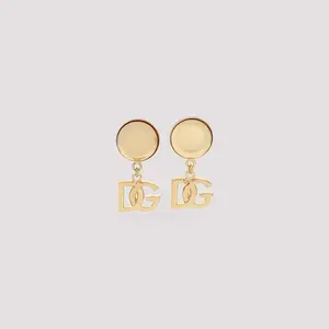 Earrings in a silver color with a hoop design, featuring a clip closure and a DG logo pendant in bronze. Crafted from 100% brass for durability and style.