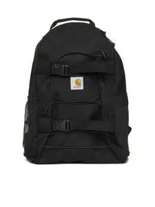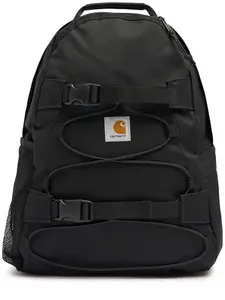 The CARHARTT WIP Shale Kickflip Backpack features a double-slider zip fastening and a single top handle. It includes adjustable padded shoulder straps for comfort, a square label at the front, and front buckles and straps for securely fixing your board. The interior consists of one main compartment, complemented by an exterior side mesh pocket and a side zip pocket. Enjoy a padded back for added support. This backpack is made from a waterproof recycled polyester blend canvas in a stylish shale color. It has a capacity of 24.8 liters and is crafted from 97% recycled polyester and 3% polyurethane, ensuring an eco-friendly choice. Made in Extra EU.