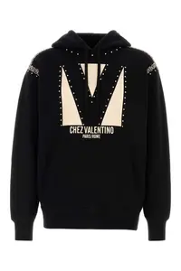 Valentino's acetate sweatshirt features contrast details and an inlaid 'Toute la V' print on the upper part. It includes a fold-up high neck, front zip closure, pockets, long cuffed sleeves, and a headband on the hem. Composition: 58% polyester, 42% cotton.