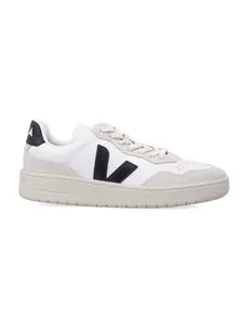 Discover the Veja v90 Beige Sneakers, featuring a low-top design and round perforated toe for breathability. These unisex sneakers come with a lace-up closure and prominent logo on the tongue, as well as applied logos on the sides. The contrasting heel showcases the logo, while the cushioned insole provides comfort, all resting on a durable rubber sole. Made with 100% leather, they are stylish and sustainable.