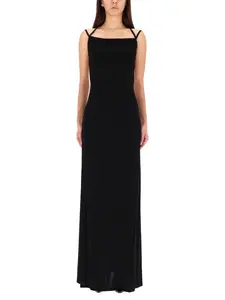 This Sleeveless Long Dress by Marine Serre is crafted from soft stretch jersey for a comfortable, body-conscious fit. Featuring an asymmetrical hemline and the signature pearl logo at the chest, it offers a modern, elegant silhouette perfect for both day and evening wear. Soft stretch jersey fabric, sleeveless design, asymmetrical hemline, pearl logo at chest, long, flowing length.